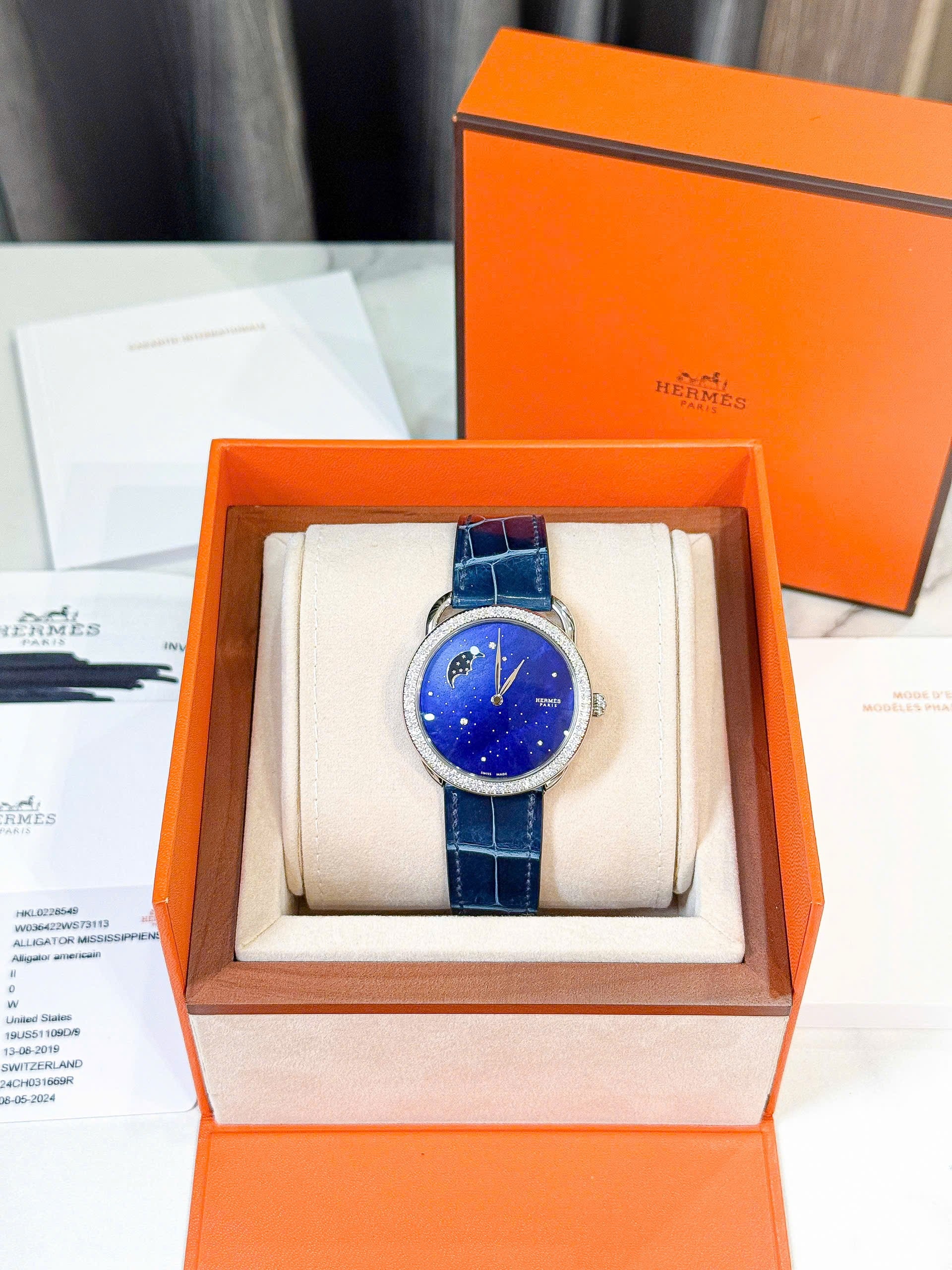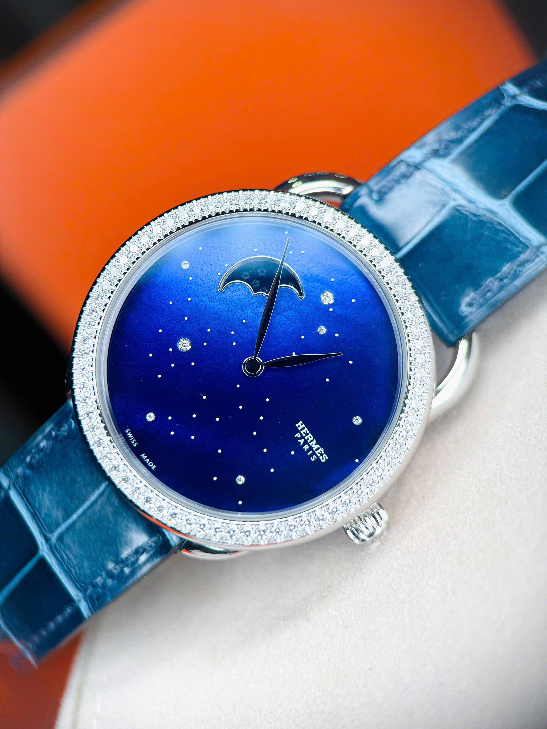 Đồng hồ Hermes size 38 với thiết kế vành kim cương và mặt moonphase đẹp quá❤️