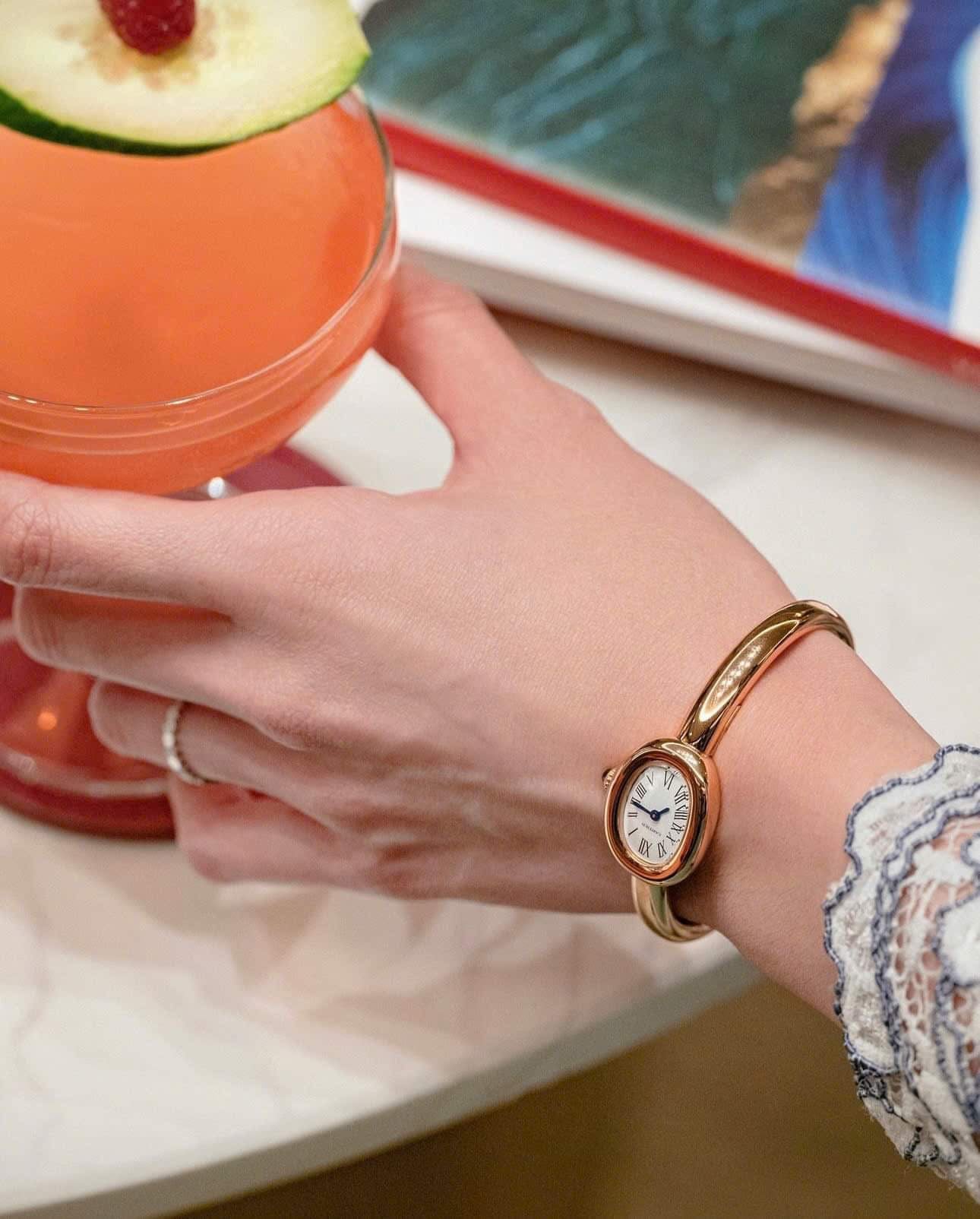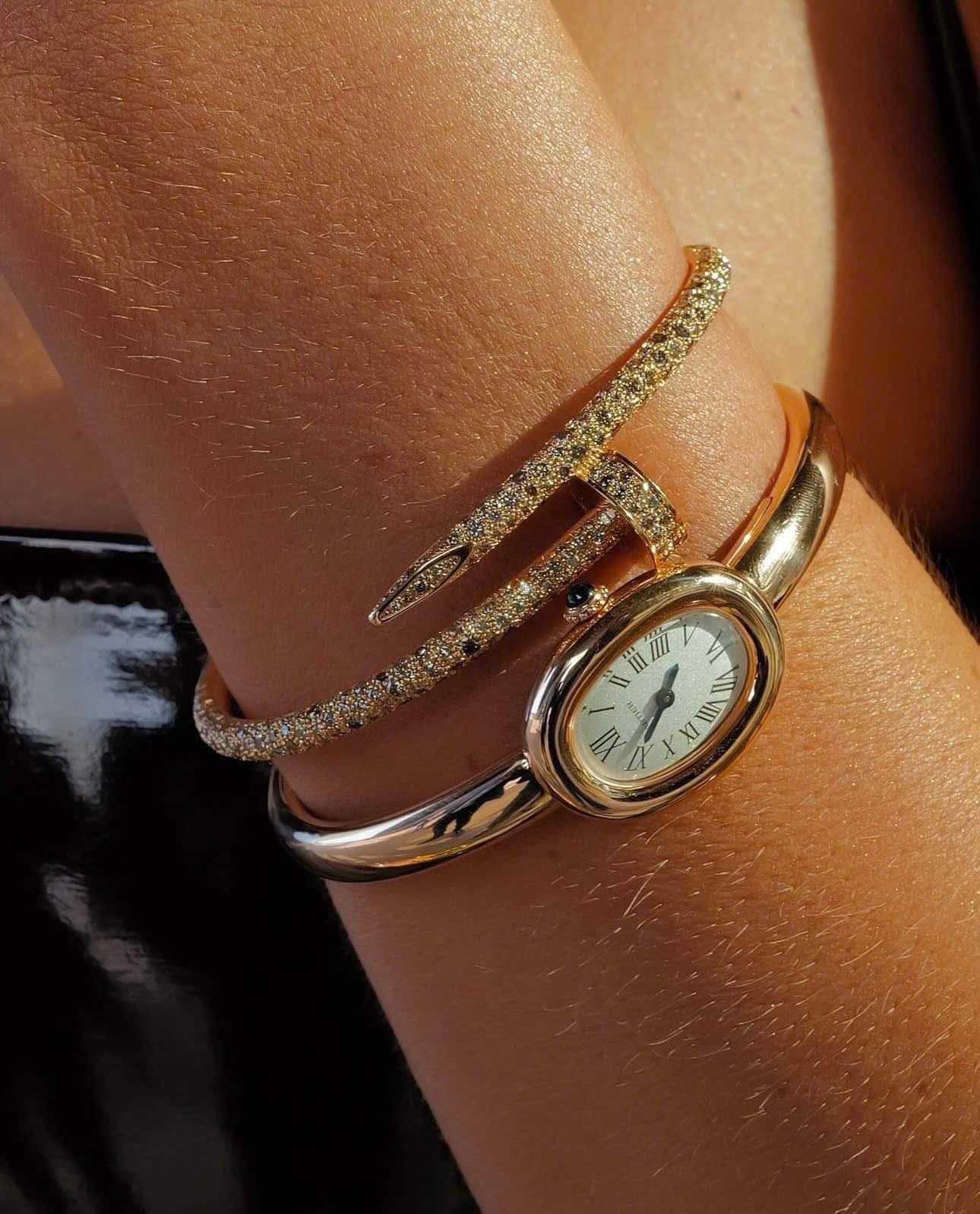 Vàng khối Rose Gold 18K, dạng bangle đeo như vòng tay, mặt kính sapphire