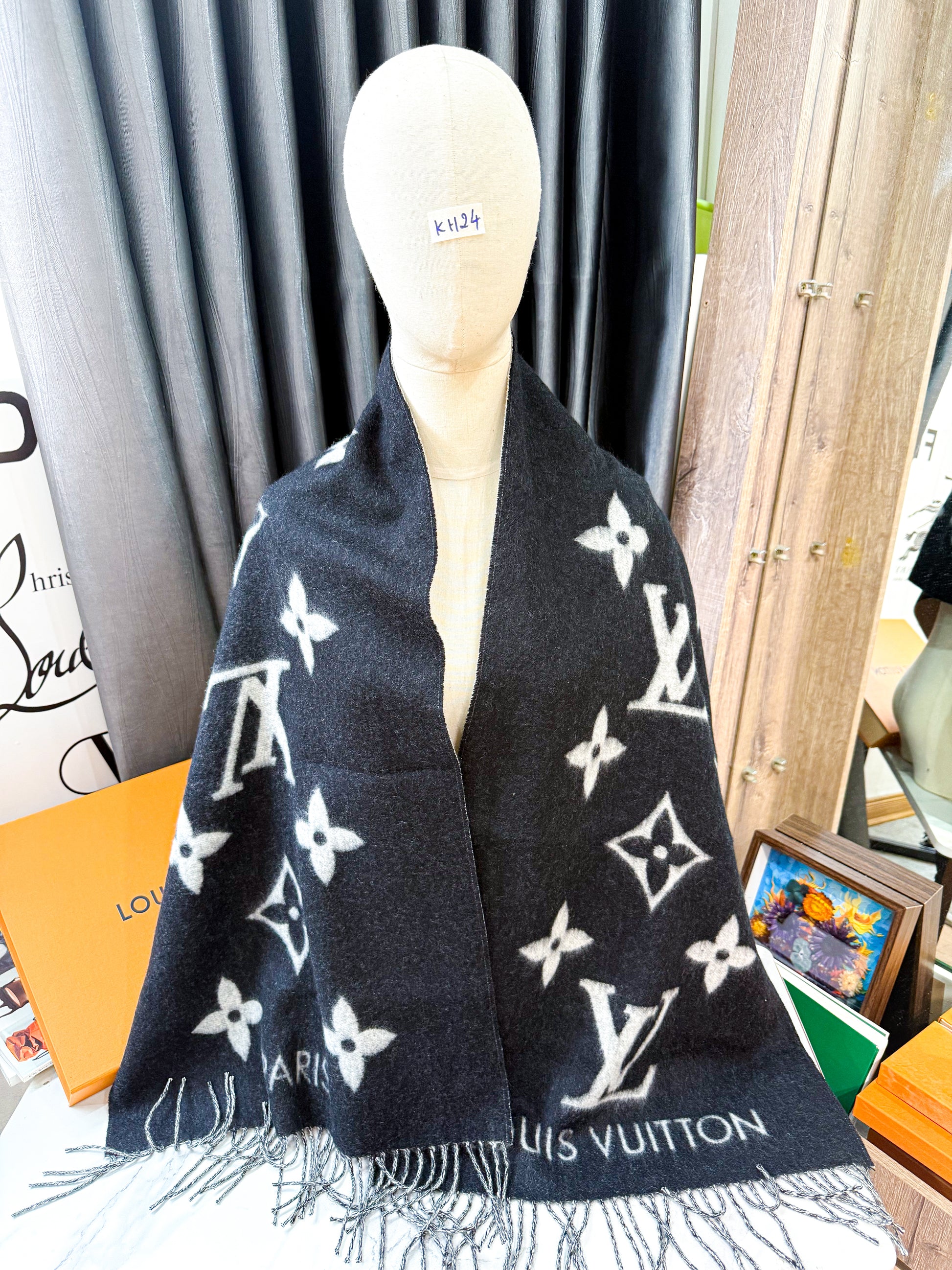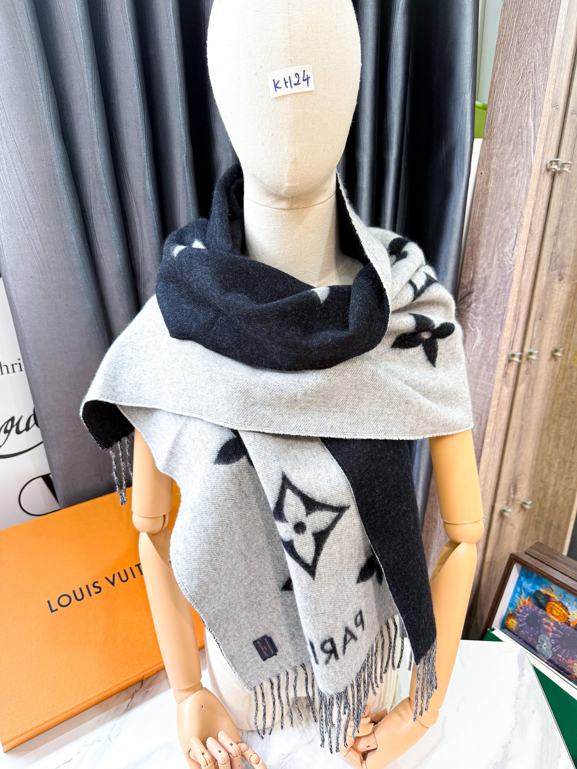 Khăn LV Cashmere Đen Ghi KH23 6/11