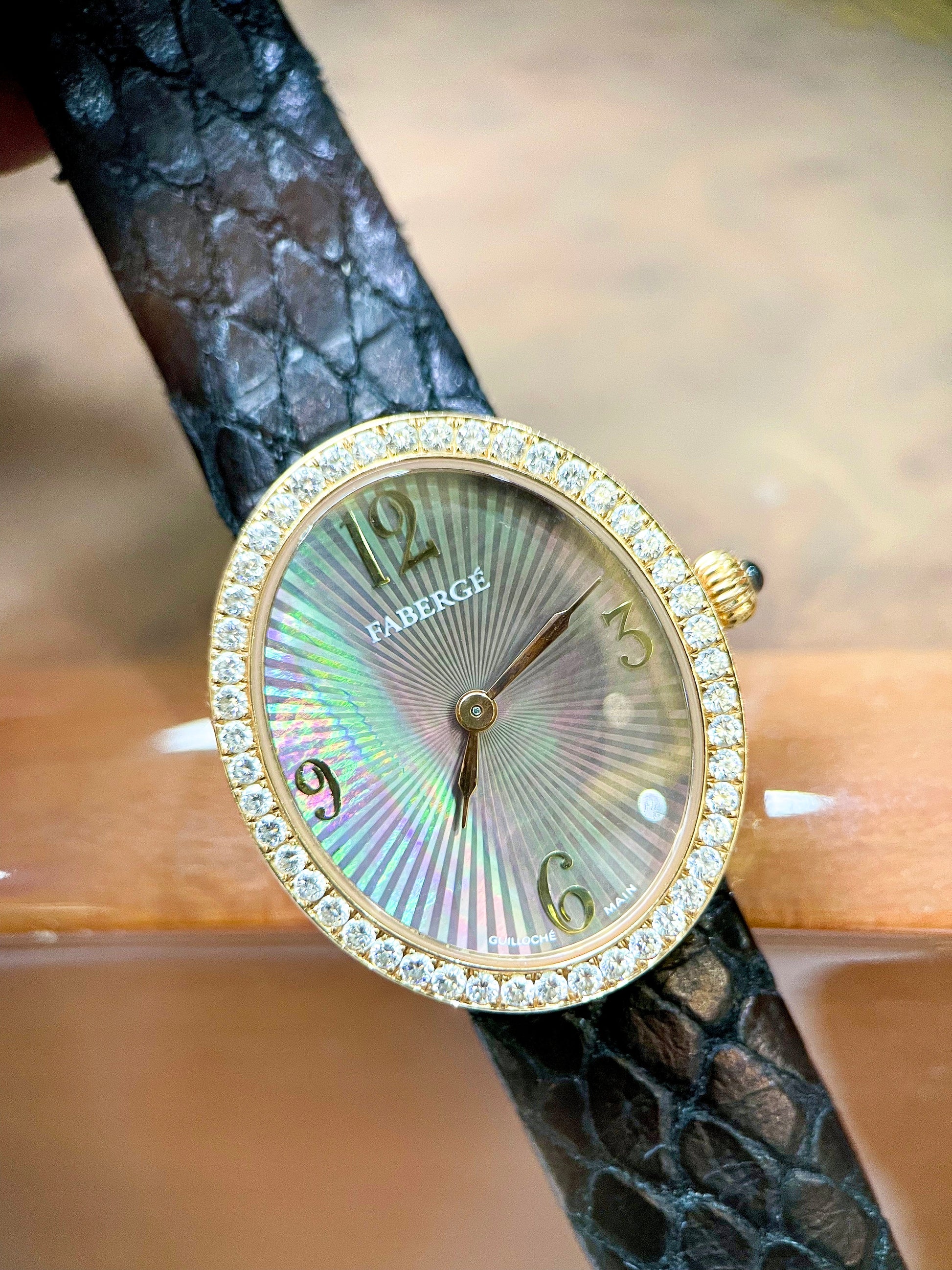 Đồng hồ Faberge vàng khối , kim cương zin, mặt khảm trai ánh tím đẹp quá ce ơiii😍